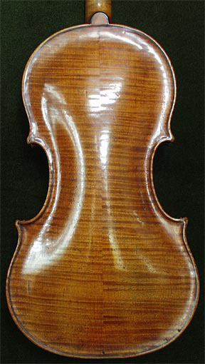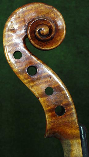 Der Zettel dieser Geige trägt die Jahreszahl 1590. Sicherlich wird die genaue Datierung und Zuordnung einer Geige nicht nur anhand des Zettels vorgenommen (nur wenige originale Zettel aus dieser Zeit haben die Jahrhunderte überstanden), aber das Modell, die Art der Wölbung und besonders der Schnitt der F- Löcher lassen den Einfluß von Andrea Amati noch deutlich erkennen. Der Ton dieses Instrumentes ist brillant und süß und zeichnet sich durch eine glasklare Ansprache aus. |